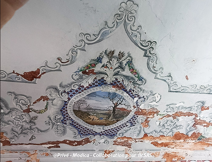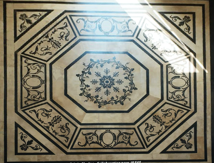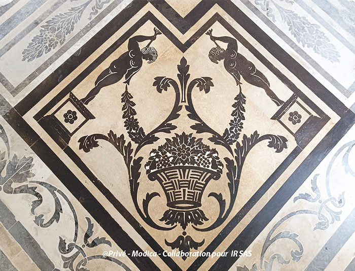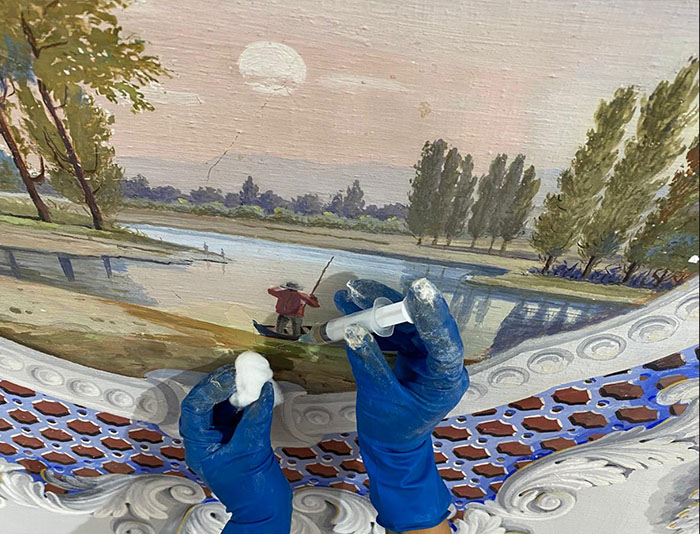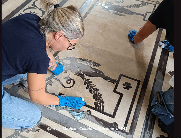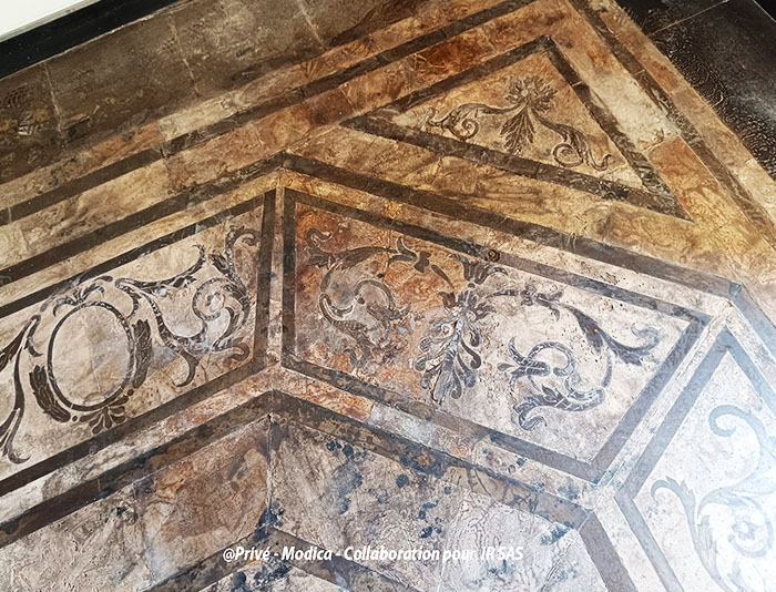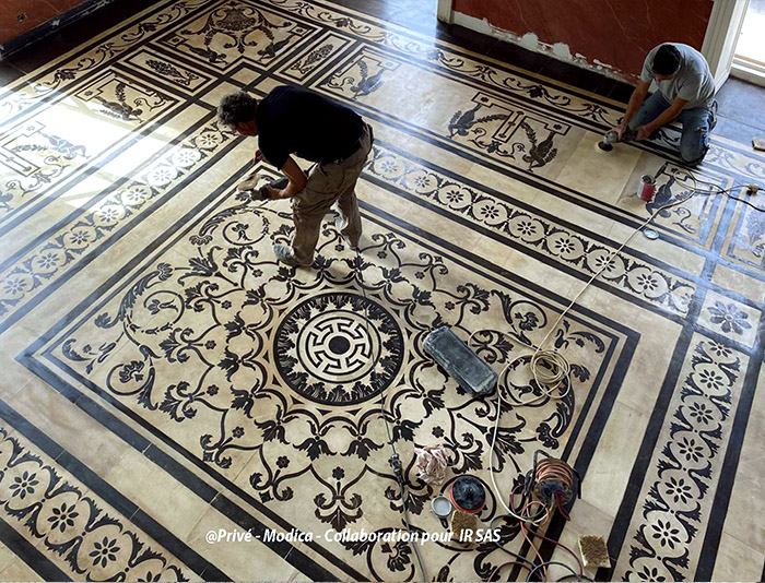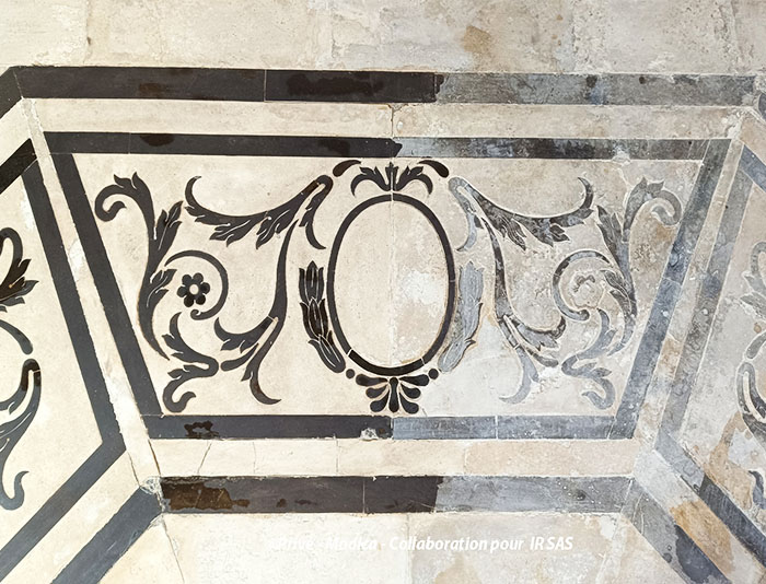 Substrats restaurés : marqueterie de pierres (sols); peintures décoratives ; peintures à l'huile ; sculpture sur pierre