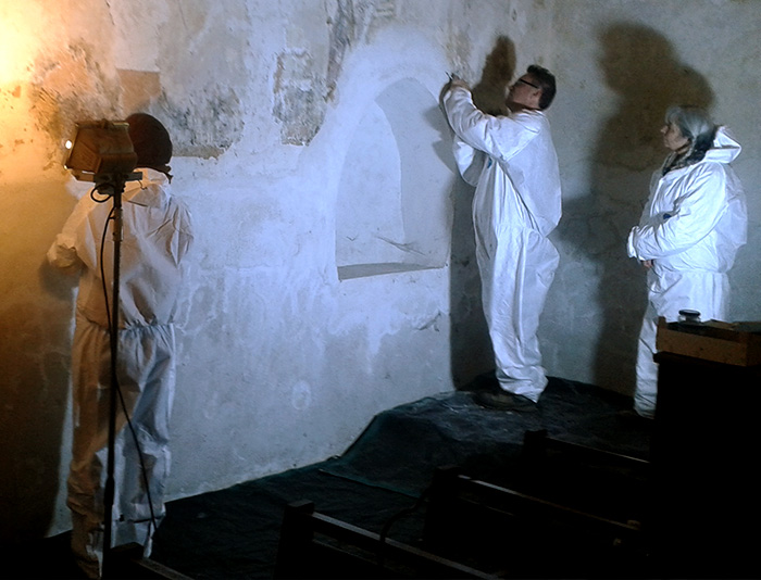 Prestations réalisées : sondages, essais de dégagement et consolidation ; constat d'état ; recherche de décors