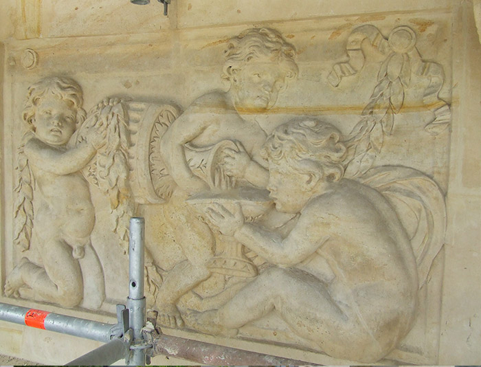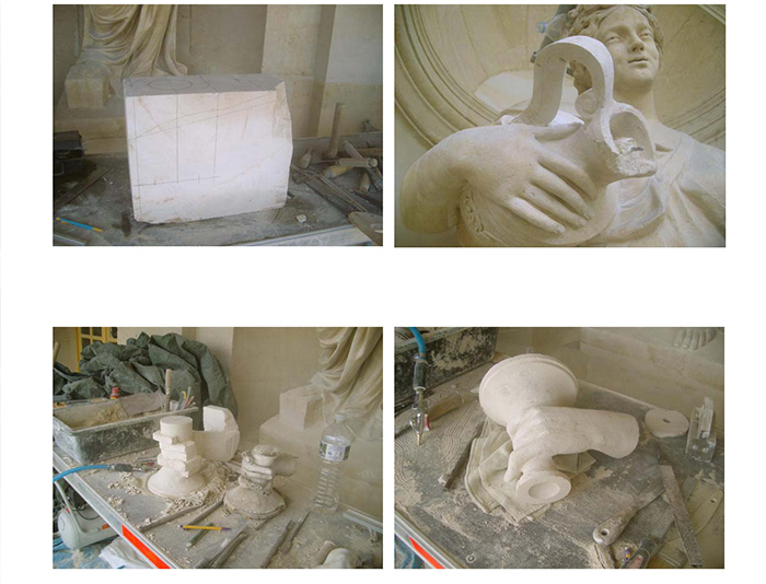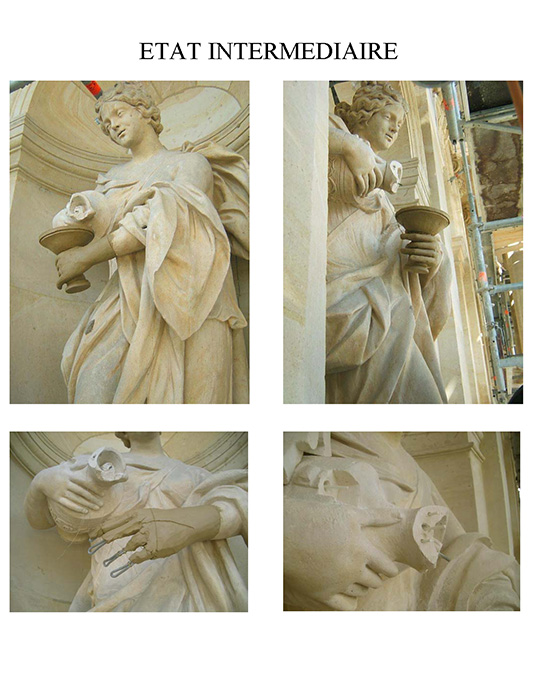 Prestations réalisées : direction de travaux de restauration Monument Historique ; expertise technique ; consolidation ; démontages/remontages structurels ; ragréage ; nettoyage ; sculpture neuve ; réintégration chromatique